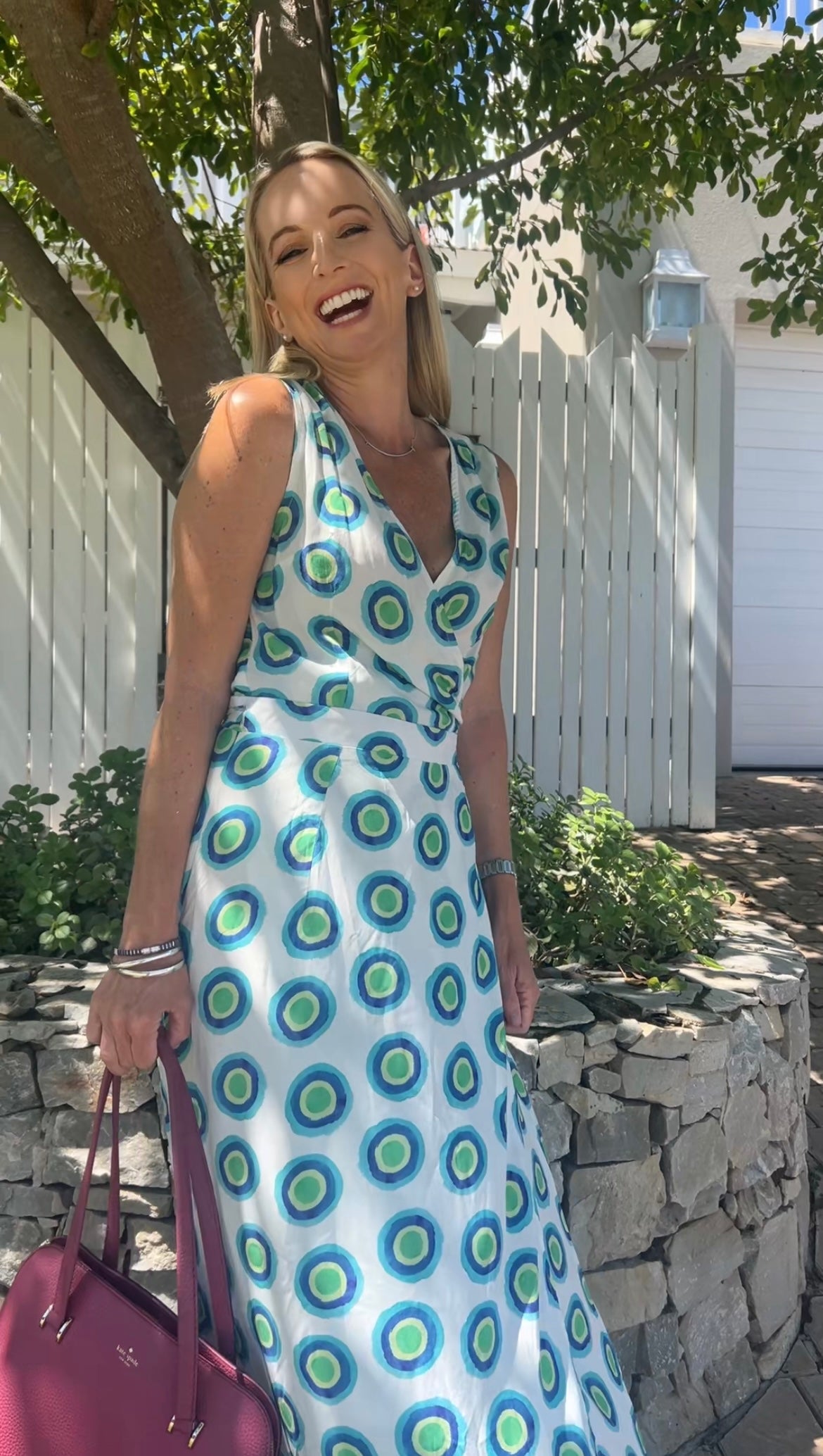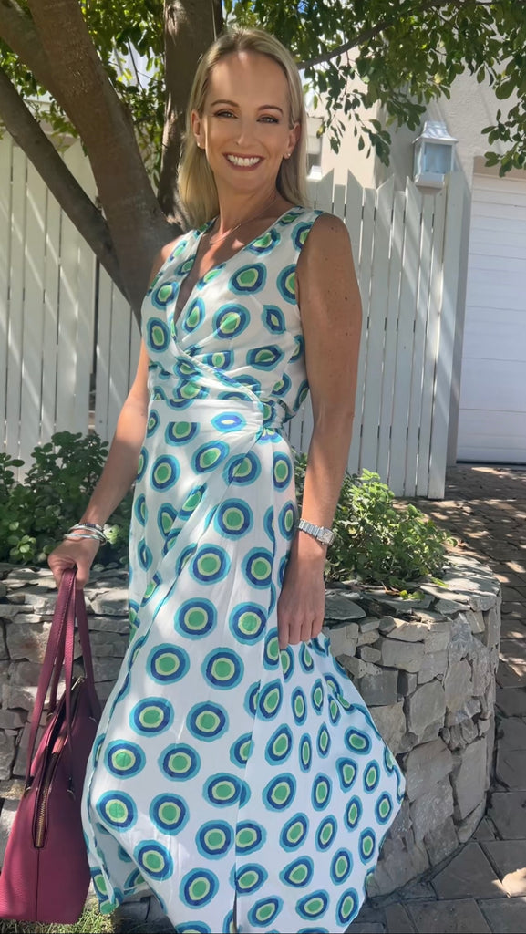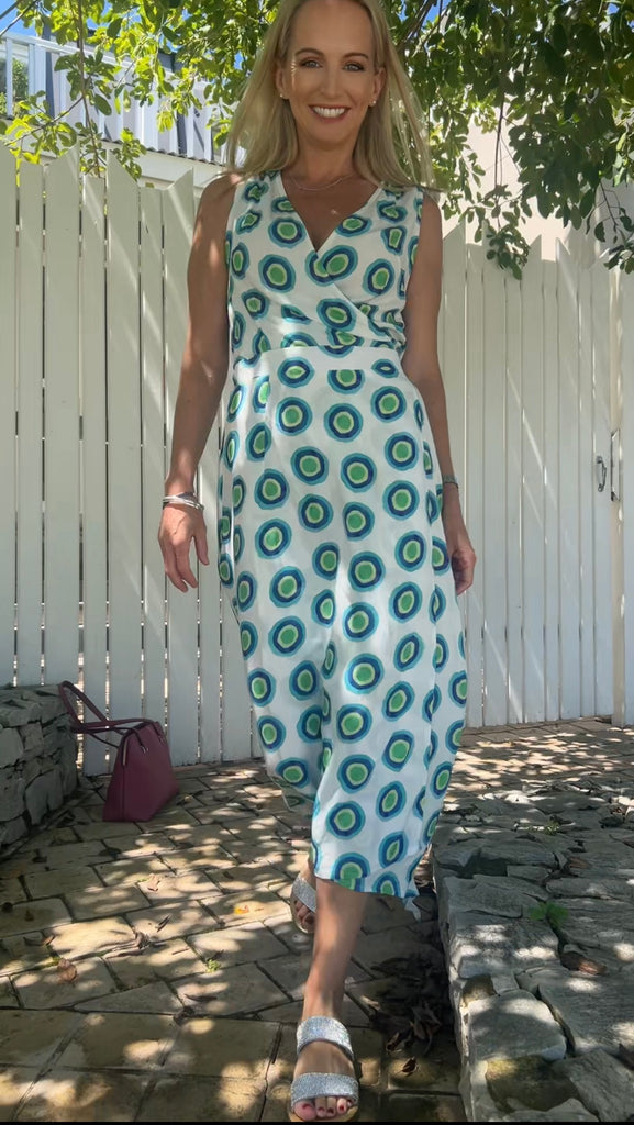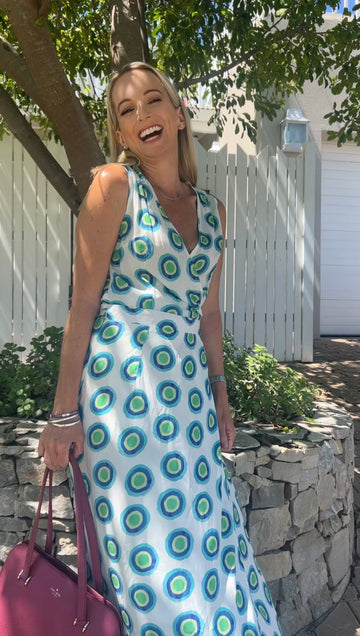 Crafted from a high-quality, lightweight viscose fabric, the dress showcases a delightful aqua dot pattern. The dot pattern add a whimsical touch and feminine aesthetic.