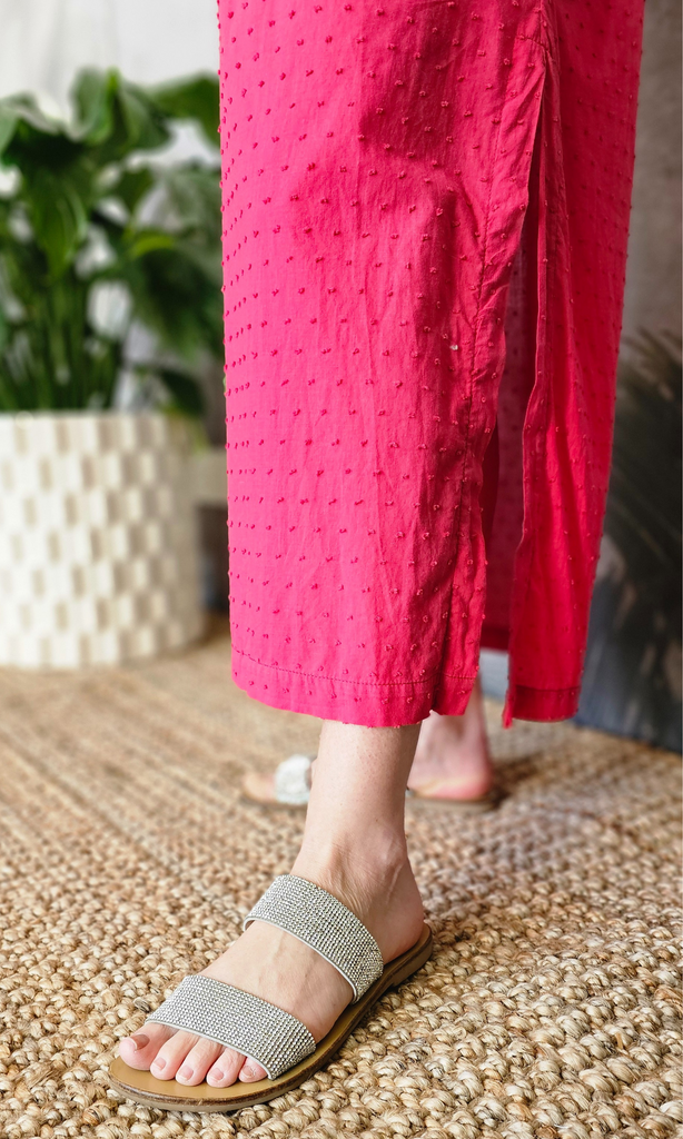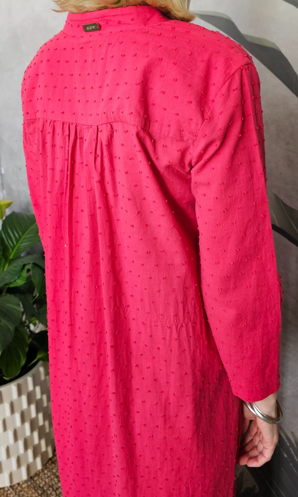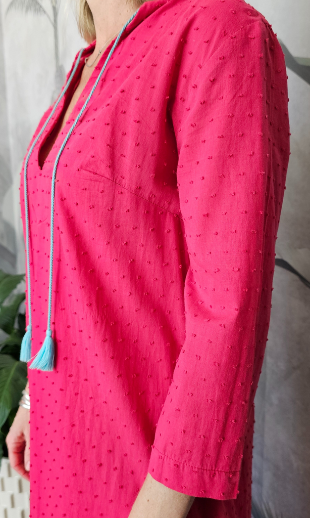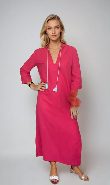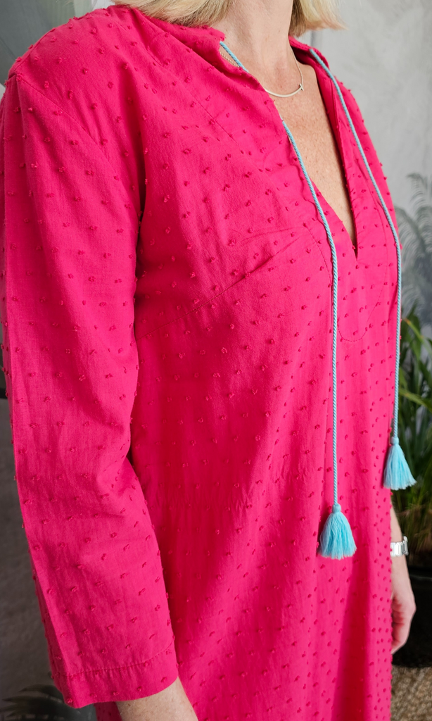 The beach is calling and we have the perfect dress to throw on over your swimsuit. This summer essential features a kaftan style cut, a banded collar (with a difference) and a low neckline. Fun and flirty tassels and side slits give this dress the perfect beach resort feel.