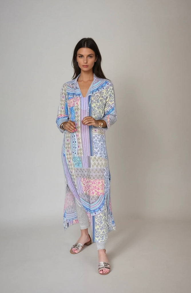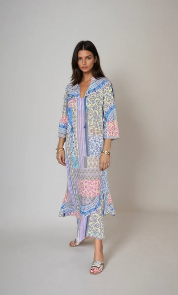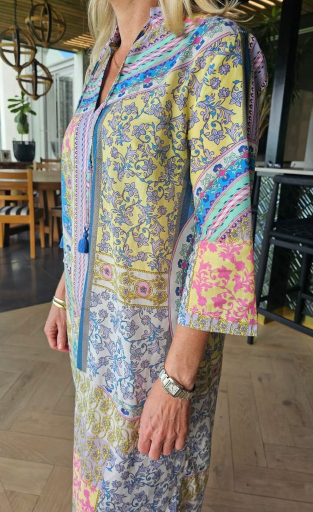 The perfect dress for over a swimsuit. Kaftan style cut, a banded collar (with a difference) and a low neckline. Fun and flirty fabric and side slits give this dress the happy feel.